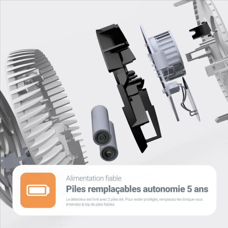 - L’alarme est fournie avec 2 piles AA qui peuvent être remplacées dès l’avertissement de batterie faible, il est recommandé de remplacer l’alarme après 10 ans